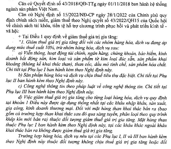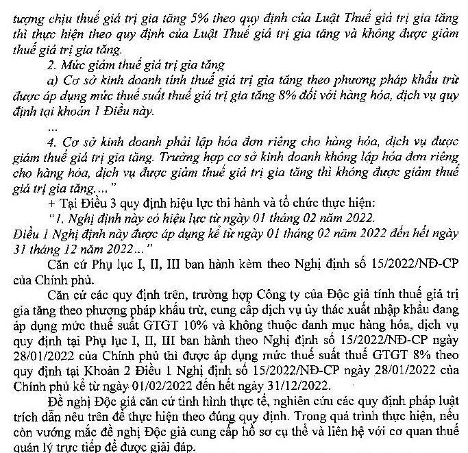 Theo Quyết định số 43/2018/QĐ-TTg ngày 01 tháng 11 năm 2018, Công ty chúng tôi tra được mã ngành của dịch vụ ủy thác xuất nhập khẩu là 8299. Công ty tôi tra trên Phụ lục I, Phụ lục II, Phụ lục III của Nghị định số 15/2022/NĐ-CP, để xem mã 8289 có được giảm thuế GTGT hay không. Nhưng cái này không thấy có ghi mã sản phẩm 8289. Tôi hỏi mã ngành của dịch vụ ủy thác xuất nhập khẩu là 8299, thì từ ngày 1/2/2022 đến 31/12/2022, khi xuất hóa đơn GTGT thì thuế GTGT là bao nhiêu %?.