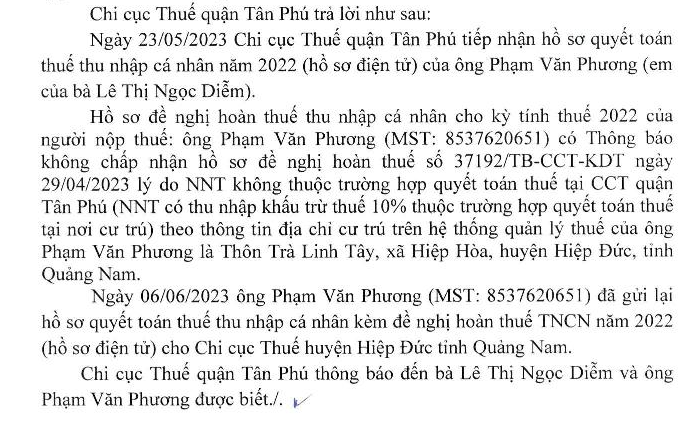 Kính gửi Tổng cục Thuế, Em tôi là Phạm Văn Phương, MST: 8537620651,có thu nhập nhiều nơi trong năm 2022 và có nộp hồ sơ quyết toán Thuế TNCN kèm hồ sơ đề nghị hoàn thuế qua cổng thông tin điện tử ngày 23/5/2023 (hệ thống tự mặc định cơ quan thuế tiếp nhận là CCT Quận Tân Phú là nơi có thu nhập cao nhất trong năm) và nhận được thông báo chấp nhận hồ sơ khai thuế và tiếp nhận hồ sơ hoàn thuế vào ngày 24/5/2023 từ CCT Quận Tân Phú. Đến hôm nay 29/5/2023, tôi nhận được Email của CCT Quận Tân Phú Thông báo không chấp nhận Hồ sơ đề nghị hoàn thuế (Số thông báo 37192/TB-CCT-KDT), Lý do: NNT không thuộc trường hợp quyết toán thuế tại CCT quận Tân Phú (do NNT có thu nhập khấu trừ thuế 10% thuộc trường hợp quyết toán thuế tại nơi cư trú). Xin hỏi: 1/ Do đã nhận được thông báo chấp nhận hồ sơ khai thuế từ CCT Quận Tân Phú (Tờ khai QTT năm 2022), tôi có phải nộp lại tờ khai quyết toán không? 2/ Hồ sơ hoàn thuế của tôi có được giải quyết tiếp tục theo mã gia dịch điện tử số 11020230006884810 hay không? Hay tôi phải gửi lại hồ sơ hoàn thuế, nếu phải gửi lại, mong cơ quan thuế hướng dẫn thực hiện cho đúng, Xin chân thành cám ơn!
