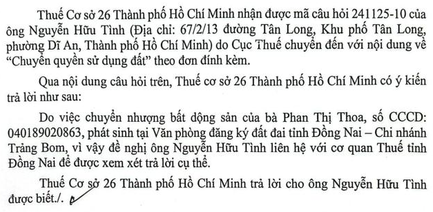 Kính chào Anh/Chị!Tôi xin được hỏi như sau: Hiện tôi có mua 1 lô đất trống thông qua đấu giá do Ngân hàng xử lí tài sản. Trong thông báo đấu giá thì giá khởi điểm chưa bao gồm thuế VAT và các loại thuế phí khác, các loại thuế, phí, chi phí này do người mua được tài sản đấu giá chịu. Sau khi trúng đấu giá ngoài số tiền trúng đấu giá tôi còn phải nộp thêm 10% VAT trên giá trúng đấu giá và tôi đã nộp đầy đủ. Tuy nhiên, khi nghiên cứu lại quy định của pháp luật mà cụ thể là tại Khoản 7, Điều 5 Luật thuế GTGT số 48/2024/QH15 thì " Chuyển quyền sử dụng đất" thuộc đối tượng ko chịu thuế. Như vậy, căn cứ quy định của pháp luật thì việc Ngân hàng thu thêm 10% trên giá trúng đấu giá này là sai quy định phải không ạ? Sai cả việc áp dụng đối tượng chịu thuế và Giá tính thuế phải không ạ? Rất mong nhận được phản hồi sớm nhất từ Quý Anh/Chi và Xin chân thành cảm ơn.