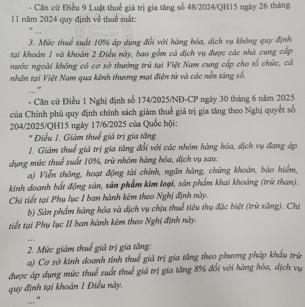 CÔNG TY TNHH THƯƠNG MAI DỊCH VỤ VÀ KỸ THUẬT SD MST: 0313666454 Kính gửi Qúy cơ quán thuế, Căn cứ vào Nghị định 174/2025/NĐ-CP (hiệu lực từ 01/07/2025 → 31/12/2026) quy định về Giảm thuế GTGT. Theo đó hàng hóa kinh doanh của chúng tôi hiện tại thuộc mã ngành 25- KHÔNG ĐƯỢC GIẢM THUẾ, và nhập khẩu có mã HS code 7315 ( Xích và các bộ phận của xích, bằng sắt hoặc thép ; Xích gồm nhiều mắt xích bằng thép nối lại; Xích con lăn bằng thép; Xích truyền động bằng thép: Xích tay gá bằng thép...). Căn cứ theo Biểu thuế nhập khẩu thì mã HS code 7315 này vẫn có VAT 10%, nên chúng tôi nhâp khai thuế vẫn 10%. Vậy chúng xin được hỏi là hàng hóa bán ra trong nước của chúng tôi là bán theo thuế nhập hàng VAT là 10 % ? Hay bán VAT 8% theo đề nghị của khách hàng ạ? Vì theo 1 số khách hàng của chúng tôi thì họ căn cứ trên Phụ lục 1 của Nghị định 174/2025/NĐ-CP thì 73- không được giảm thuế , nhưng 15 không có trong Phụ lục 1 thì được giảm thuế còn 8% Chúng tôi mong được sự hồi đáp sớm của Quý cơ quan thuế để không làm chậm trễ hoạt động kinh doanh của doanh nghiệp. Trân trọng và xin cảm ơn.