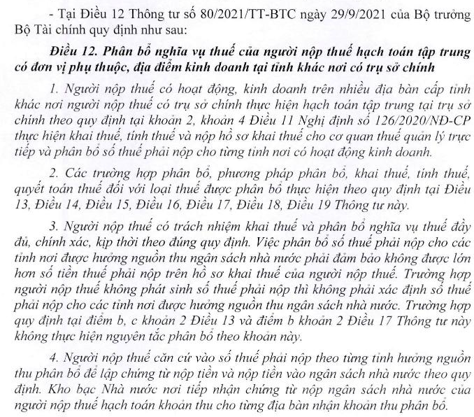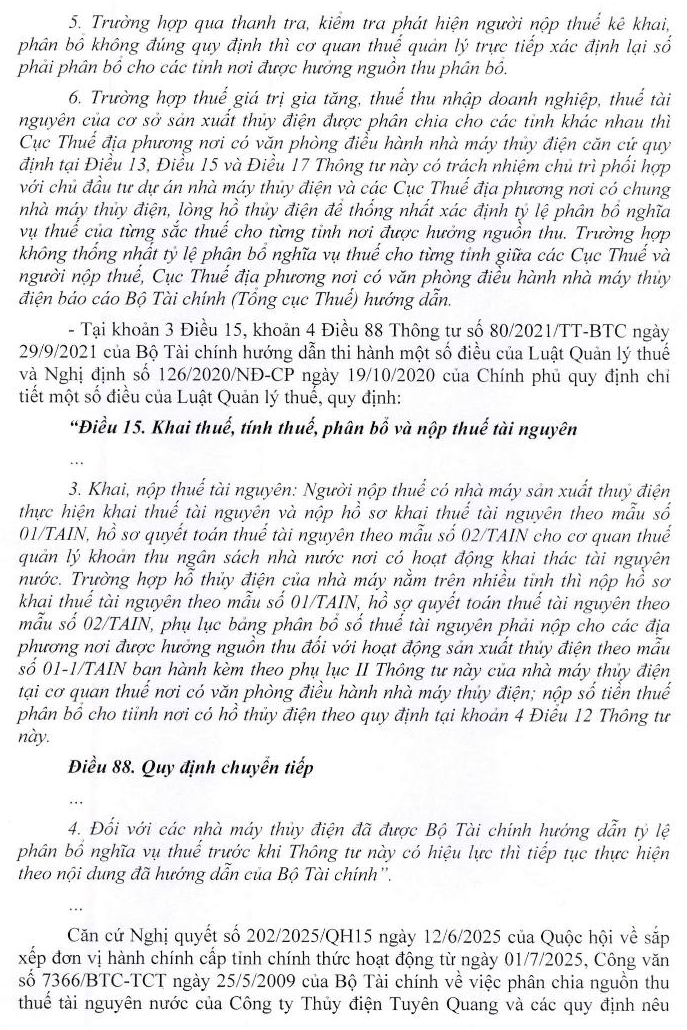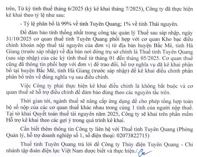 Kính gửi Bộ Tài chính ! Kính gửi Cục Thuế ! Công ty Thủy điện Tuyên Quang có phát sinh kê khai và nộp thuế tài nguyên (nước thủy điện). Tờ khai mẫu 01/TAIN + Phụ lục 01-1/TAIN (Ban hành kèm theo thông tư 80/2021/TT-BTC). Tờ khai tháng 1- 5/2025, trong Phụ lục 01-1/TAIN đơn vị có kê khai phân bổ cho 3 tỉnh: Tuyên Quang (87%), Hà Giang (12%), Bắc Cạn (1%) (theo Văn bản 7366/BTC-TCT ngày 25/5/2009). Thực hiện quy định về sáp nhập đơn vị hành chính cấp tỉnh và hướng dẫn tại VB số 221/TQU-QLDN1 ngày 30/7/2025 của Thuế tỉnh Tuyên Quang, từ tờ khai tháng 6/2025 đến nay, trong Phụ lục 01-1/TAIN, đơn vị có kê khai phân bổ cho 2 tỉnh: Tuyên Quang (99%), Thái Nguyên (1%). Xin hỏi Bộ Tài chính, Cục thuế hướng dẫn một số nội dung sau: 1. Theo quy định về kê khai điều chỉnh tờ khai thuế, Đơn vị có phải lập tờ khai bổ sung cho tờ khai tháng 1-5/2025 để điều chỉnh phụ lục 01-1/TAIN từ phân bổ cho 3 tỉnh (Tuyên Quang (87%), Hà Giang (12%), Bắc Cạn (1%) ) thành 2 tỉnh (Tuyên Quang (99%), Thái Nguyên (1%)) không?. Nếu phải thực hiện điều chỉnh thì căn cứ điều chỉnh được quy định tại nội dung thuộc văn bản nào. 2. Khi lập hồ sơ khai Quyết toán thuế tài nguyên năm 2025, tại phụ lục phân bổ đơn vị thực hiện phân chia cho những tỉnh nào tỉ lệ là bao nhiêu. Rất mong nhận được phản hồi sớm của Quý cơ quan. Trân trọng!
