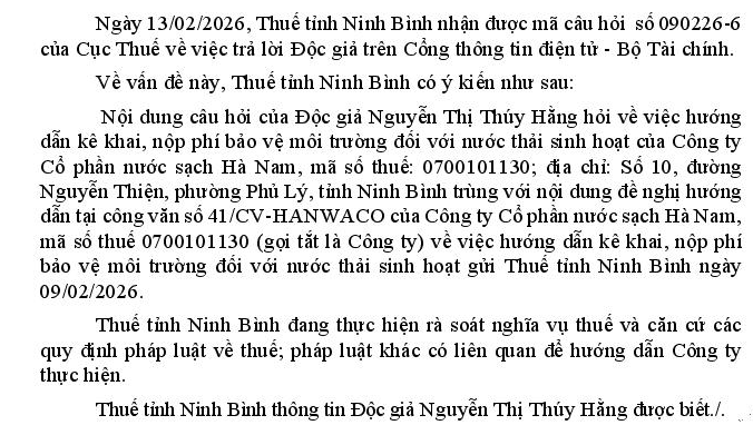Công ty Cổ phần Nước sạch Hà Nam (sau đây gọi tắt là Công ty), Mã số thuế: 0700101130; địa chỉ trụ sở chính tại: Số 10, đường Nguyễn Thiện, Phường Phủ Lý, Tỉnh Ninh Bình. Hiện nay, bên cạnh hoạt động cấp nước trên địa bàn tỉnh Ninh Bình, Công ty đang thực hiện dịch vụ cấp nước sinh hoạt cho một số khu vực thuộc địa bàn thành phố Hà Nội, bao gồm 12 xã, cụ thể: - Huyện Phú Xuyên (cũ): Xã Phú Xuyên, Phượng Dực, Chuyên Mỹ, Đại Xuyên. - Huyện Mỹ Đức (cũ): Xã Mỹ Đức, Hồng Sơn, Phúc Sơn, Hương Sơn. - Huyện Ứng Hòa (cũ): Xã Ứng Hòa, Hòa Xá, Vân Đình, Ứng Thiên. Căn cứ Nghị định số 346/2025/NĐ-CP ngày 29/12/2025 của Chính phủ quy định về phí bảo vệ môi trường đối với nước thải (Nghị định 346): - Tại Khoản 2 Điều 3; Điểm b, c Khoản 2 Điều 8 và Khoản 3 Điều 11 Nghị định 346 quy định: Tổ chức cung cấp nước sạch là tổ chức thu phí bảo vệ môi trường đối với nước thải sinh hoạt; có trách nhiệm mở sổ sách kế toán theo dõi riêng, kê khai và nộp số tiền phí thu được vào ngân sách nhà nước; Cơ quan thuế có trách nhiệm kiểm tra việc khai, nộp và quyết toán phí. Tuy nhiên, do Công ty có trụ sở chính tại tỉnh Ninh Bình nhưng phát sinh hoạt động cấp nước và thu phí tại địa bàn thành phố Hà Nội (khác tỉnh với nơi đóng trụ sở chính), Công ty đang gặp vướng mắc trong việc xác định thẩm quyền quản lý và quy trình thực hiện nghĩa vụ ngân sách. Để đảm bảo thực hiện đúng quy định pháp luật, Công ty Cổ phần Nước sạch Hà Nam kính đề nghị Quý cơ quan xem xét, hướng dẫn các nội dung sau: 1. Xác định cơ quan thuế quản lý trực tiếp, nơi nộp hồ sơ khai phí và nơi nộp phí bảo vệ môi trường đối với lượng nước thải sinh hoạt phát sinh tại địa bàn thành phố Hà Nội trong trường hợp nêu trên. 2. Hướng dẫn cụ thể về trình tự, thủ tục, biểu mẫu hồ sơ kê khai và phương thức nộp phí (trực tiếp, điện tử hoặc hình thức khác) phù hợp với mô hình hoạt động liên tỉnh của Công ty. 3. Các hướng dẫn liên quan khác (nếu có) để đảm bảo việc triển khai được thống nhất và thuận lợi. Công ty Cổ phần Nước sạch Hà Nam mong sớm nhận được văn bản hướng dẫn từ Quý cơ quan. Xin trân trọng cảm ơn./.