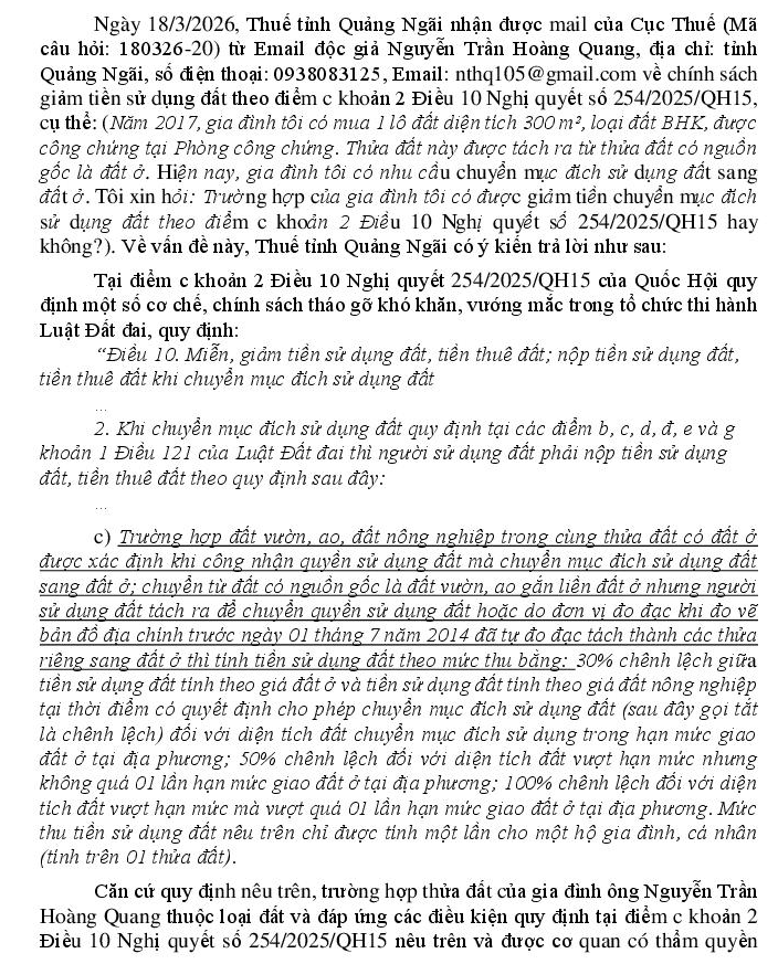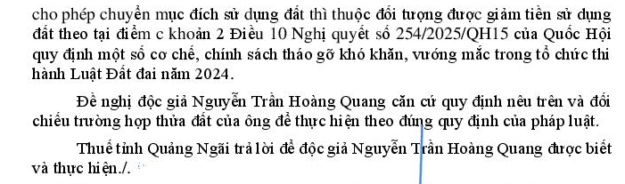 Tôi xin hỏi: Trường hợp của gia đình tôi có được giảm tiền chuyển mục đích sử dụng đất theo điểm c khoản 2 Điều 10 Nghị quyết số 254/2025/QH15 hay không?